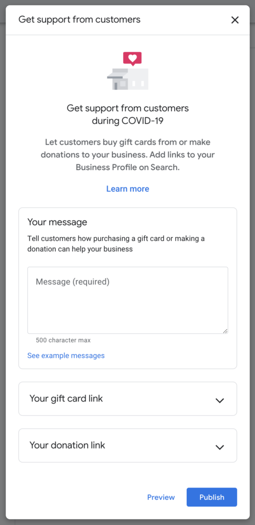 GMB Support Links gives you the power to direct interested clients to pages where they can leave a donation to your hospital or purchase gift cards for friends and family. The feature allows you to not only add a donation and gift card link to your business profile page but to include a brief message to your clients about how you intend to spend any donated funds and how gift card purchases can go a long way toward easing financial pressures in these challenging times.